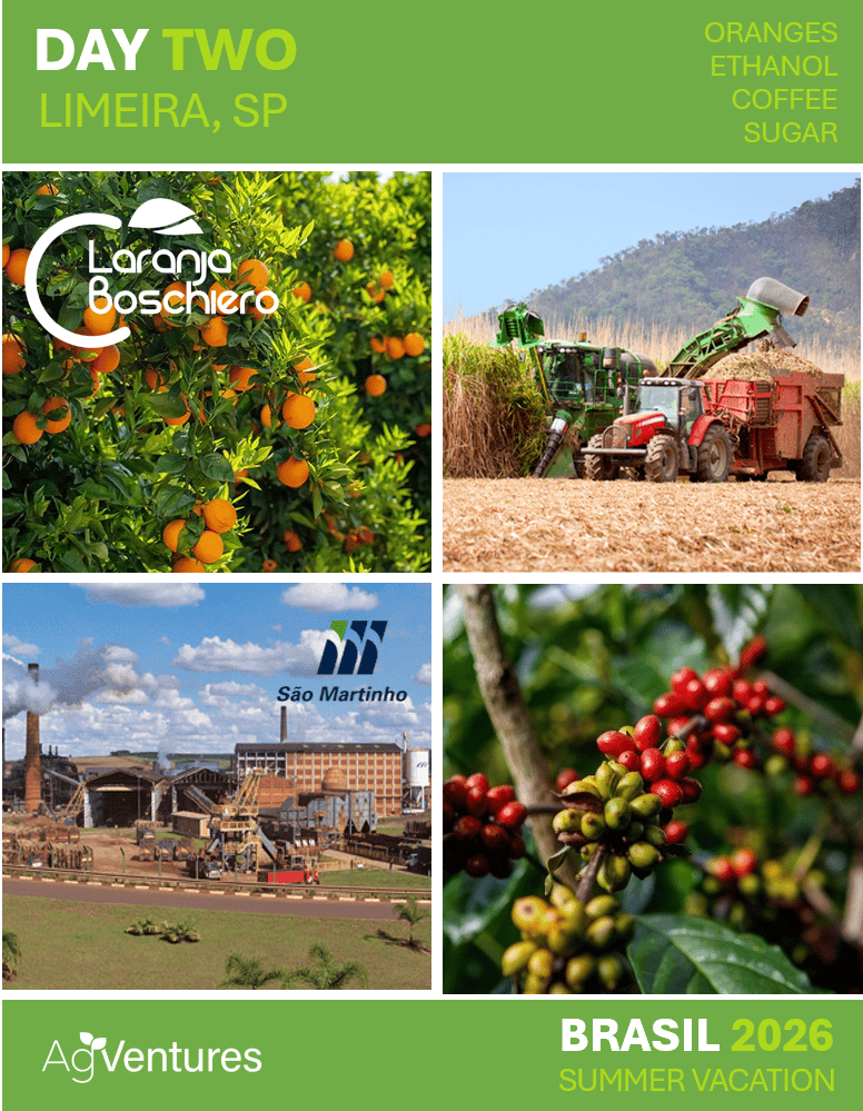 Thoughtfully curated from start to finish, this AgVenture brings you face-to-face with key pillars of Brazil’s agricultural economy—orange juice, coffee, sugar, ethanol, cattle, and Safrinha corn—offering a rare, ground-level perspective on how production, processing, and global demand intersect across one of the world’s most important agricultural regions.