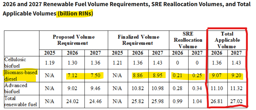 EPA set a high — but expected — bar for biomass-based diesel (D4) at 8.86 billion RINs for 2026 and 8.95 billion RINs for 2027 — the first time in program history EPA expressed the BBD standard in RINs rather than physical gallons.