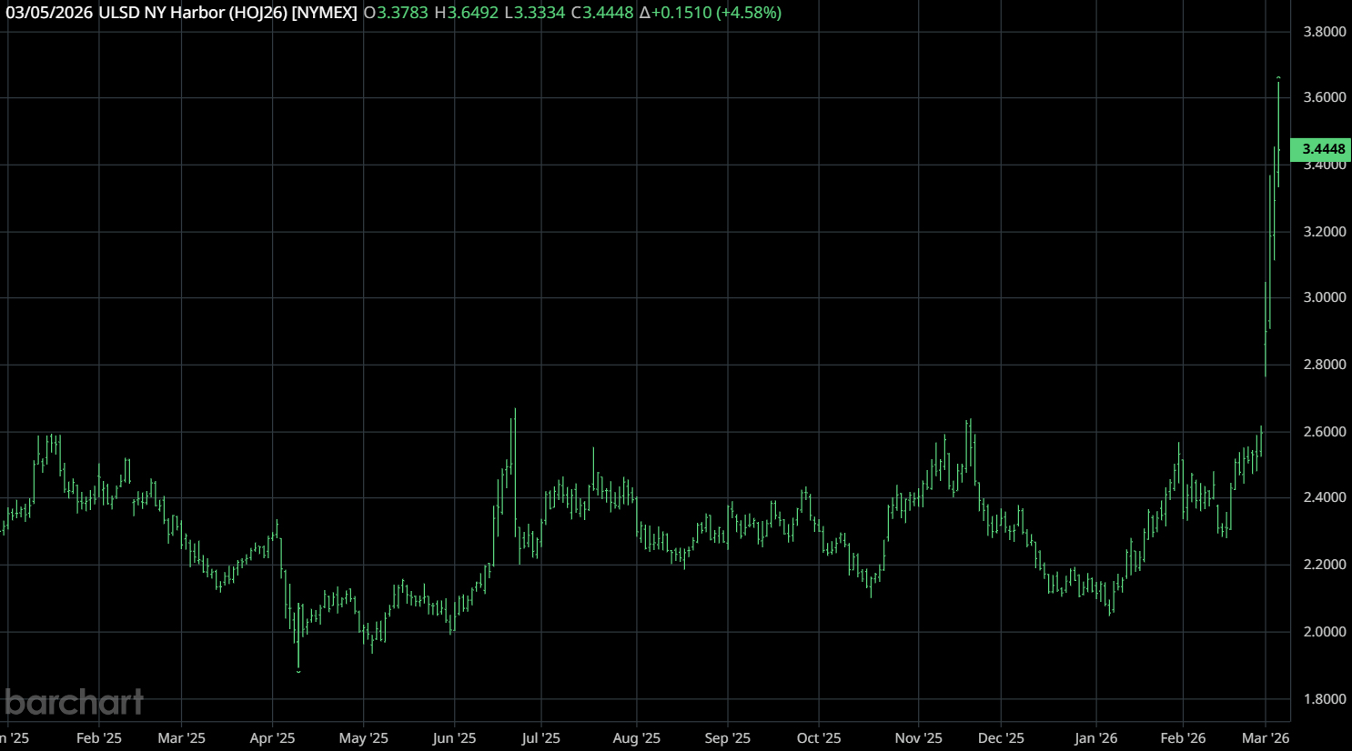 Heating oil traded nearly 11% higher, hitting $3.6492 before settling near $3.45, up 4.8% on the day.