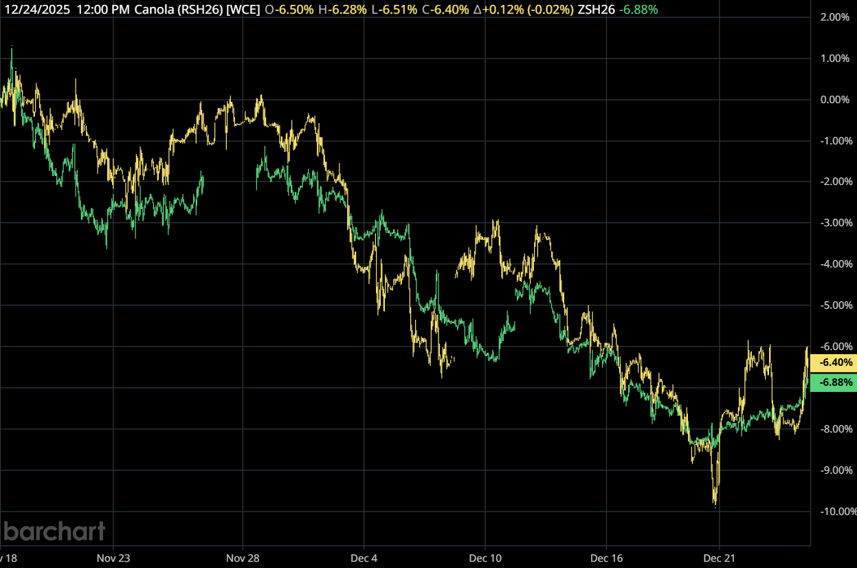 After reaching two-year highs last summer on weather fears and strength in soybean oil, canola has since collapsed 20% as Canada–China trade tensions intensified.
