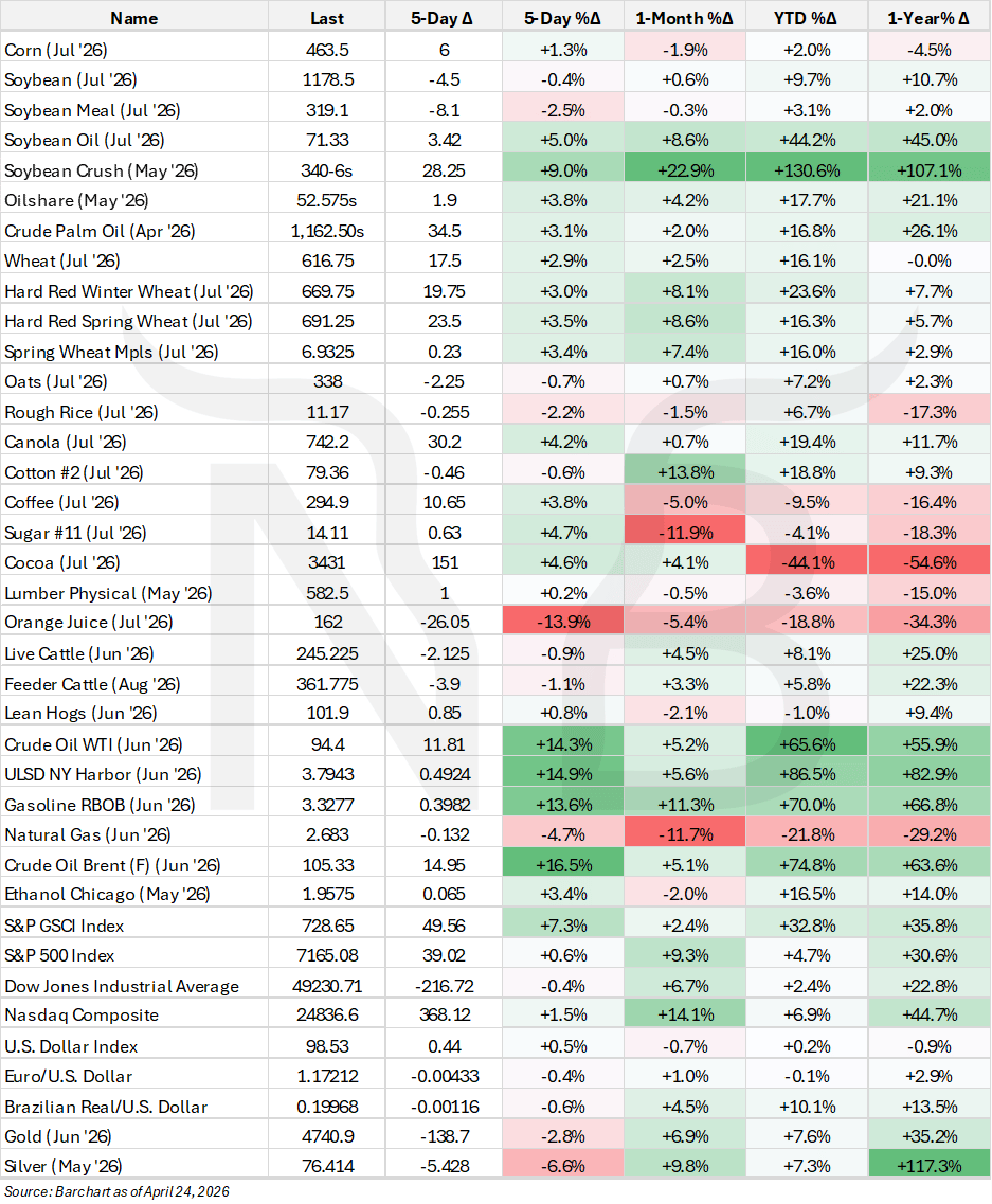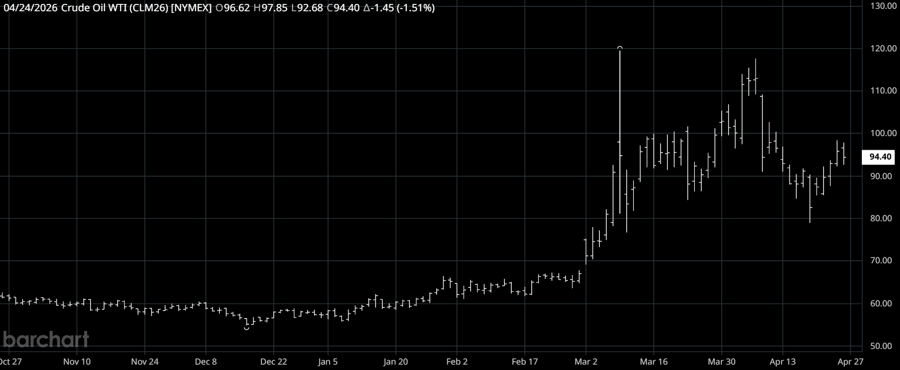 Crude led the charge — WTI up +14.3% on the week to $94.40, with Brent holding north of triple digits at $105.30, up +16.5%.