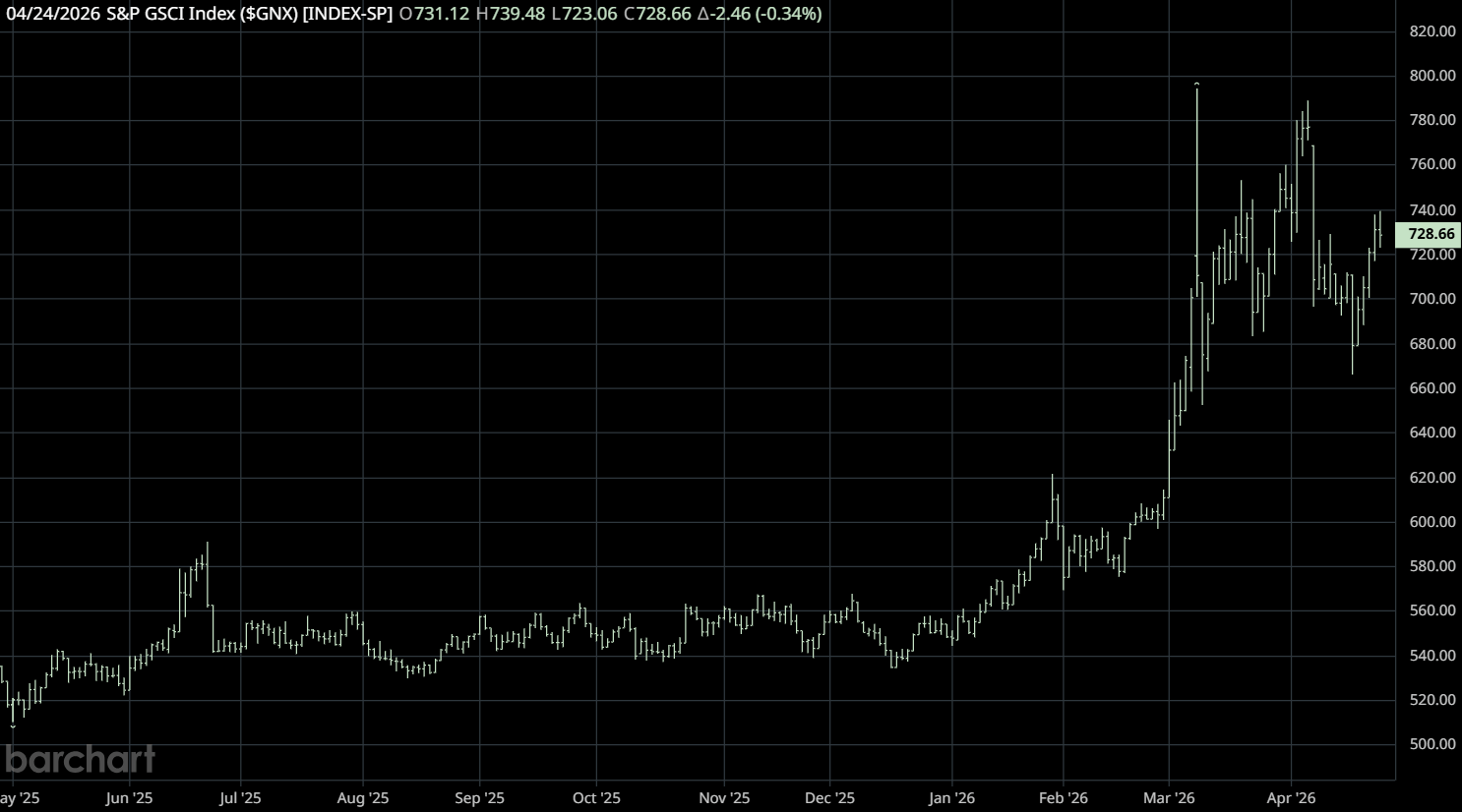 Strength in energy markets pushed the Goldman Sachs Commodity Index up 7.3% on the week, closing at 728.66 on Friday.