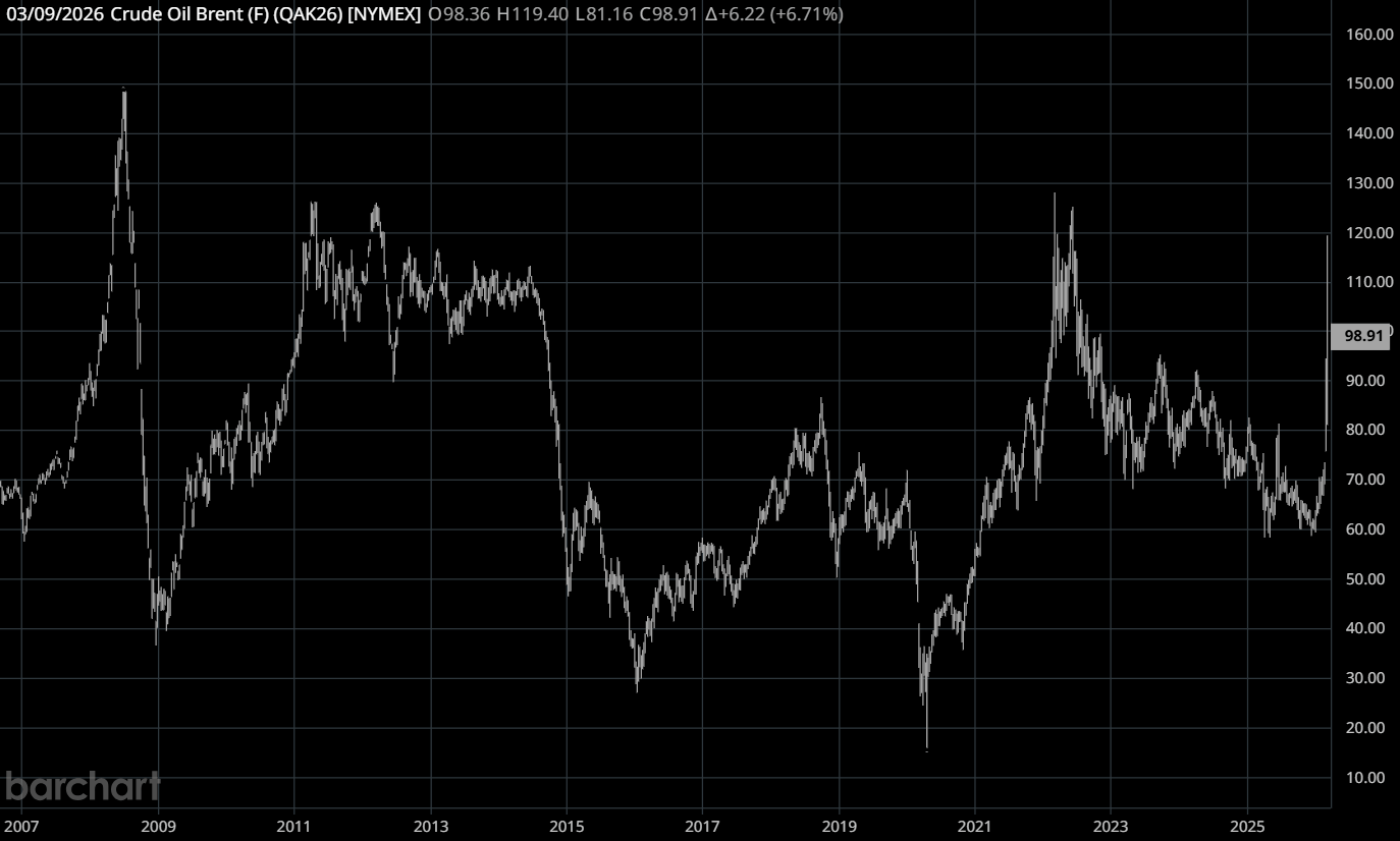 This weekly Brent chart helps put the move into perspective — not only the speed of the rally over the past two weeks, but the level itself.